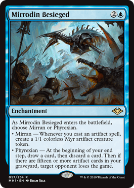 Mirrodin Besieged is a card that offers an early-game advantage and a late-game win condition all in one card. In an artifact-heavy shell, it allows you to go super wide. In the same shell, drawing it late in the game can make you win on that turn. Unlike other ‘auto-win’ conditions that happen during your upkeep, choosing ‘Phyrexian’ on the turn you play Mirrodin Besiege will win you the game (for as long as your opponent doesn’t wipe your graveyard clean – we’ll get to this later).