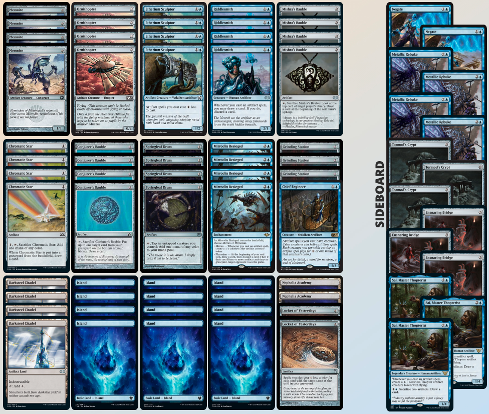 Etherium Sculptor brings our mana curve down to ‘free’ levels, with most of our spells in the deck costing 1 or 2, we will achieve Affinity speeds without necessarily running affinity-based cards. Chief Engineer is our 5th copy of Etherium Sculptor just to make sure we consistently draw them early. Locket of Yesterdays plays a unique role but it won’t be backbreaking if we don’t draw into it. We will be sacrificing a lot of our artifacts and having them in the graveyard will turn Locket into a Sculptor as well.