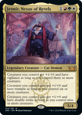 Cards like Black Market Tycoon captures a jank player’s attention like bees to a garden. Few cards allow you to make ‘tokens’ for free by simply tapping and because it’s not legendary, you can definitely do this more often which is why the card penalizes you for creating too much Treasure. But what if the token doesn’t come out as a treasure. Jinnie Fay helps solve that problem. She converts any token into cats or dogs. She didn’t say the token has to be a creature token, she just said if a token was made, she’ll convert it. Isn’t that convenient! Another token factory is Rabble Rousing. What it hides away isn’t that important compared to its passive ability to generate a stream of 1/1 Citizen tokens equal to the number of creatures that attacked that turn. You see where we’re going?