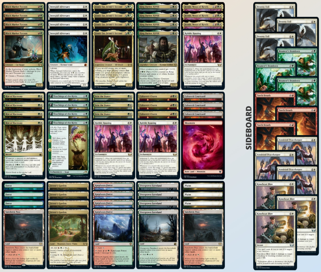 Cabaretti Charm does it all – removal, gives trample, and starts our token engine going. Teachings of the Kirin almost duplicates what our Charm does by giving us a 1/1, grows our lords, and turns into a creature that makes tokens. Rite of Harmony is our card draw which is insane under the right circumstances. You can cast Rite before Rabble Rousing triggers and you get to draw equal to the number of attacking creatures you have essentially. You can also cast this at upkeep when Teachings exiles itself and returns as a creature netting you a card for free. If you have Black Market Tycoon and Jinnie Fay still out, tapping Tycoon draws a card as well! You should not run out of cards in any game if you time this spell right.