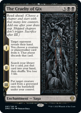 One other card on the sideboard worth mentioning is Graveyard Trespasser. She’s a 2-for-1 card as well forcing the opponent to discard whenever they attempt to interact with her. She can definitely be slotted in the mainboard if you’re anticipating an aggressive meta. She takes the place of The Cruelty of Gix which is better suited against midrange or control decks.