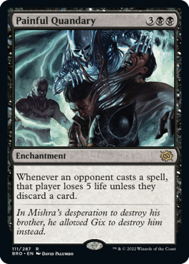 Speaking of a quandary, today’s deck tech is by a Brothers War reprint, Painful Quandary. It’s a control card that punishes people for playing spells and forcing them to pay the price with their life totals or discard another card. If you damage an opponent once with this card, you’ve got your money back already. The trick here is to attack your opponent’s hand as much as possible to make sure they don’t have any left and will be forced to take damage from Painful Quandary.