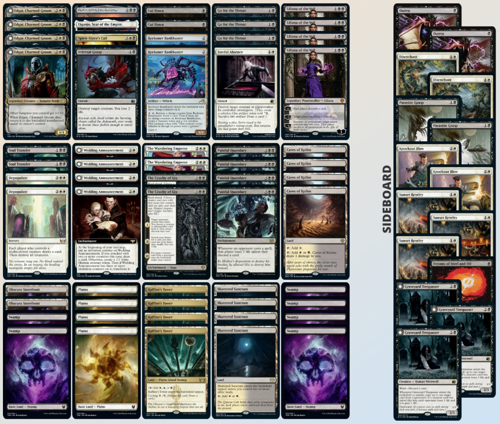 We are playing a playset of Edgar, Charmed Groom because he’s essentially a two-for-one card forcing opponents to use 2 cards to kill him which makes a midgame Painful Quandary so much more potent.